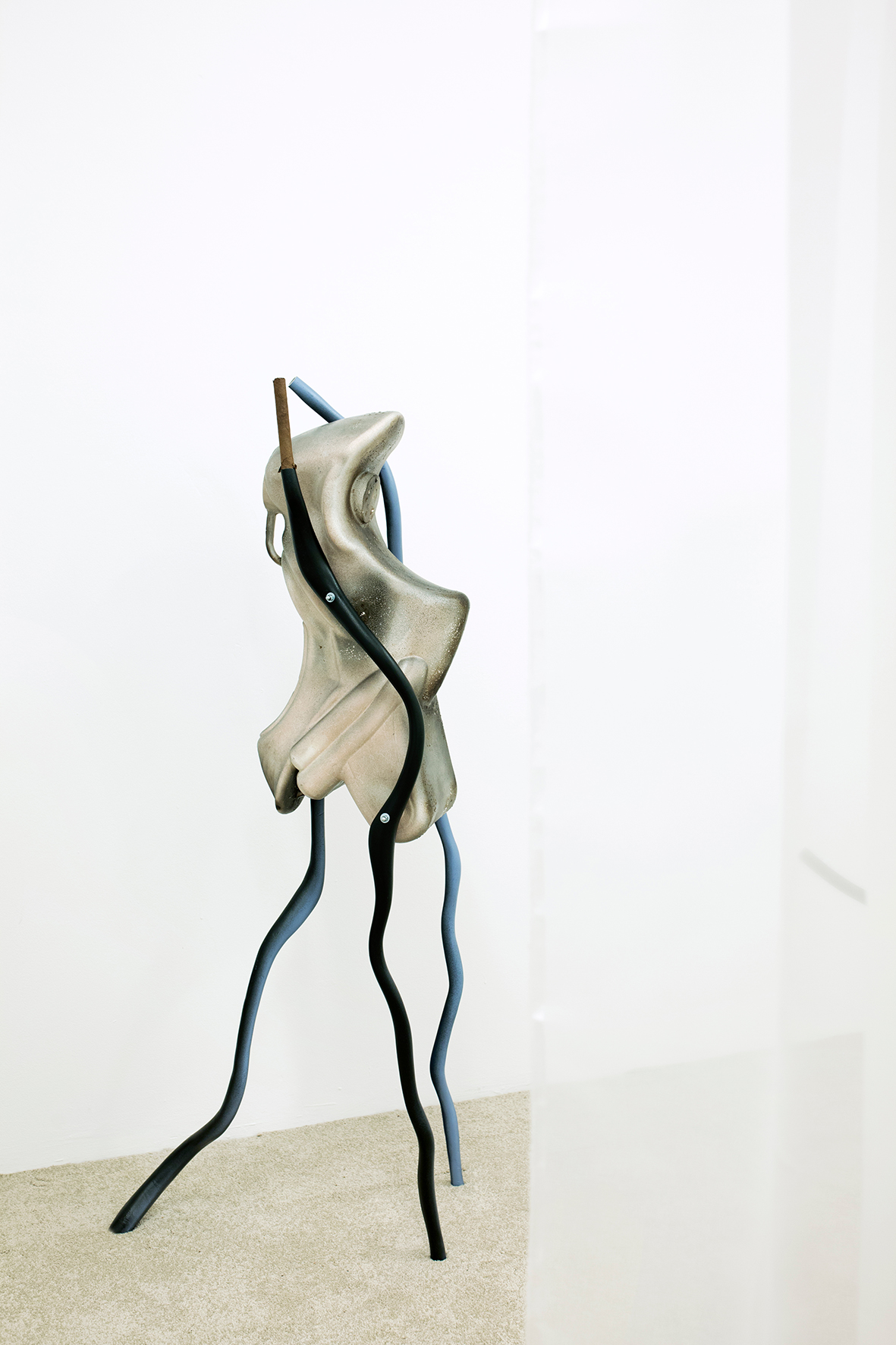 Jesmonite, bent aluminum tubes, epoxy, wood, spray paint, cigar.