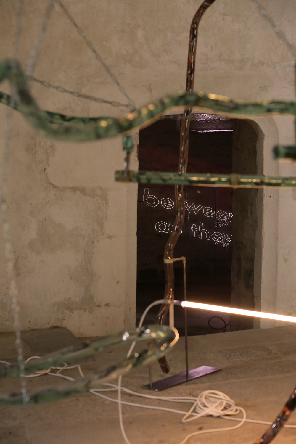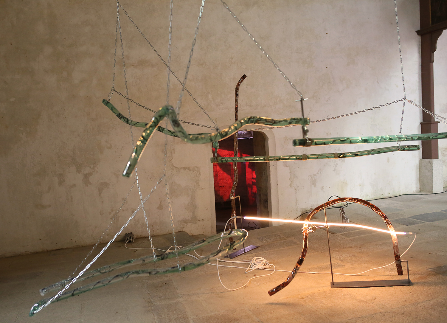 Plexiglass tubes, polyester resin, carbonized computer cables, batteries, latex tourniquets, steel plates, safety chains, clamps, neon, ex-votos in aluminum casts, variable dimensions, 2018